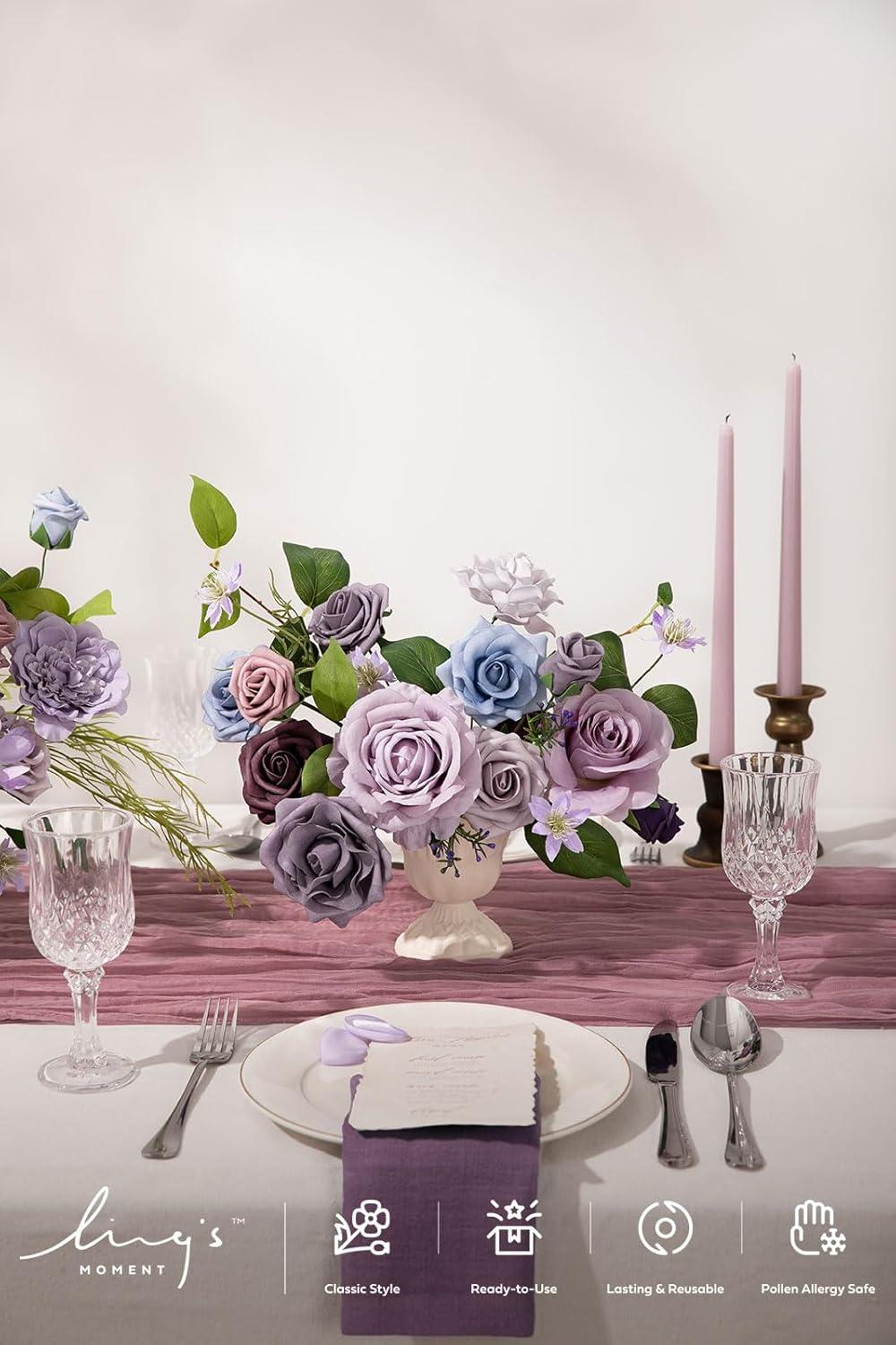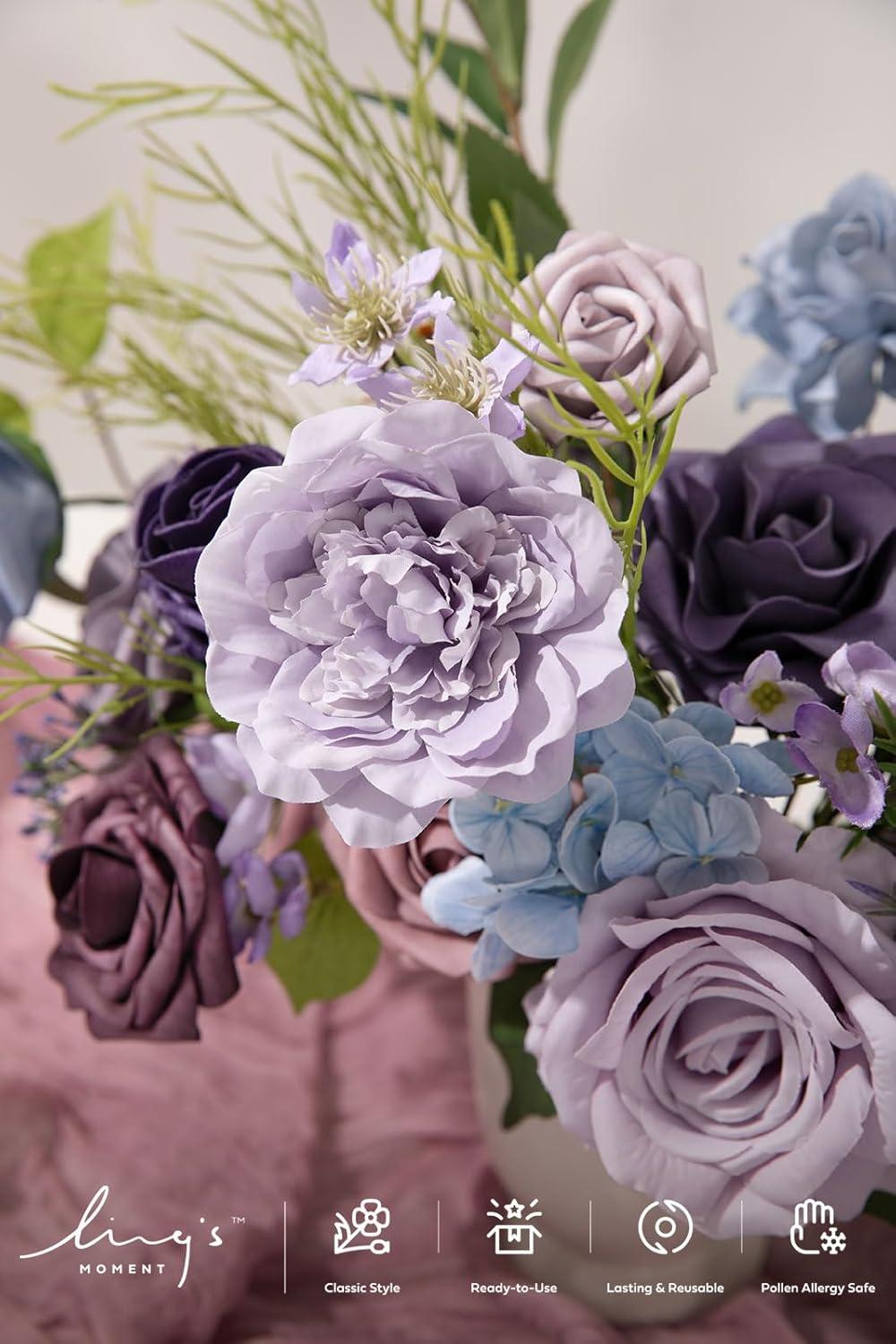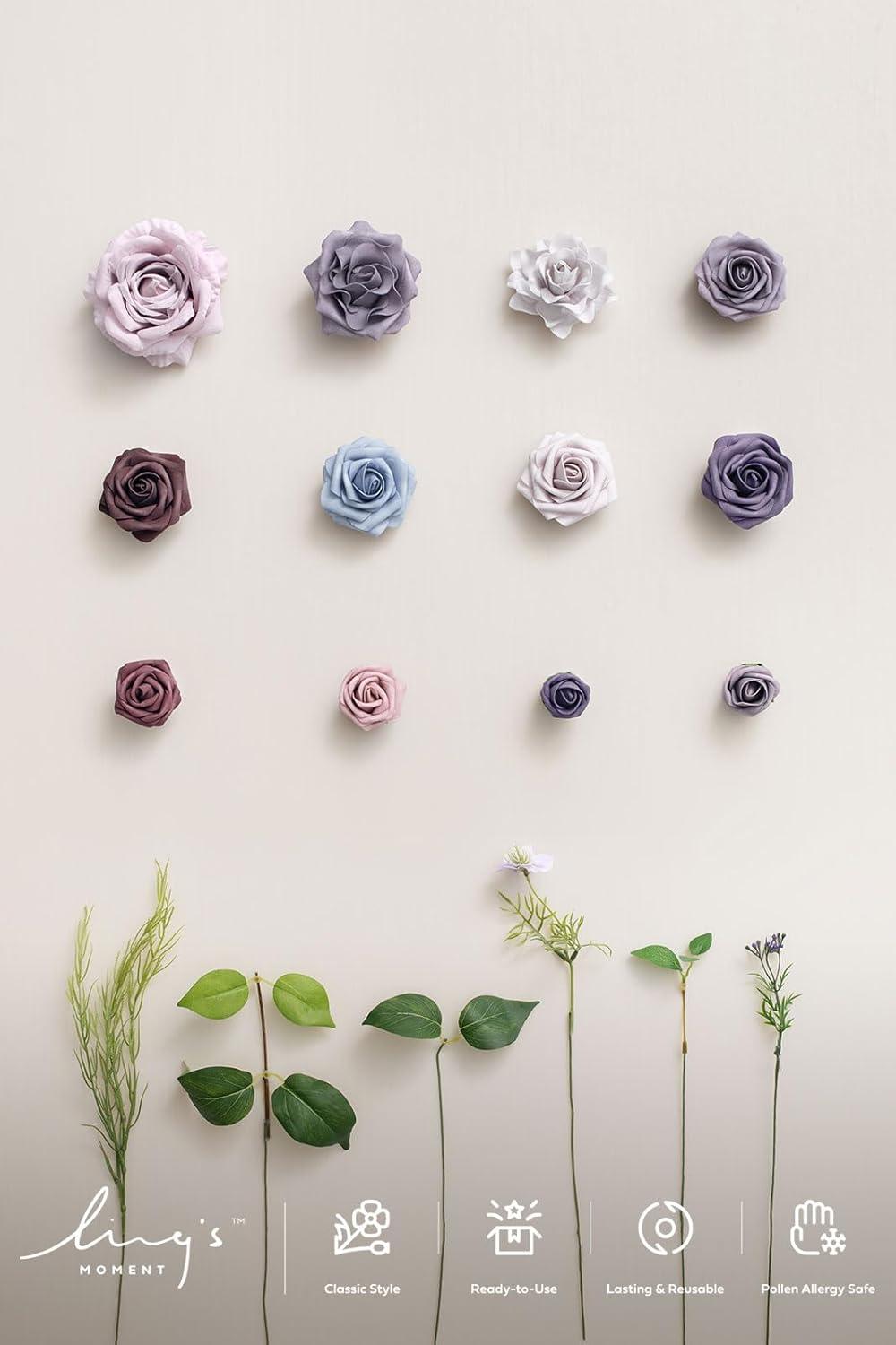 Ling’s moment Fake Flowers Box, Faux Artificial Greenery Stems Foam Roses Silk Leaves for Centerpieces Bouquet Wedding Floral Arrangements Bridal Shower Party, Lavender & Cream, Deluxe Combo(Prpl-lavender & Plum)