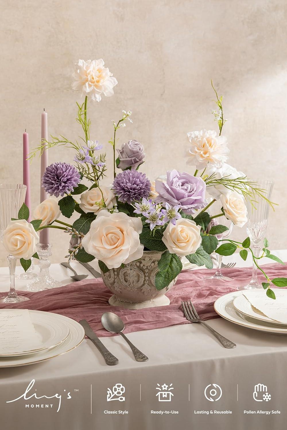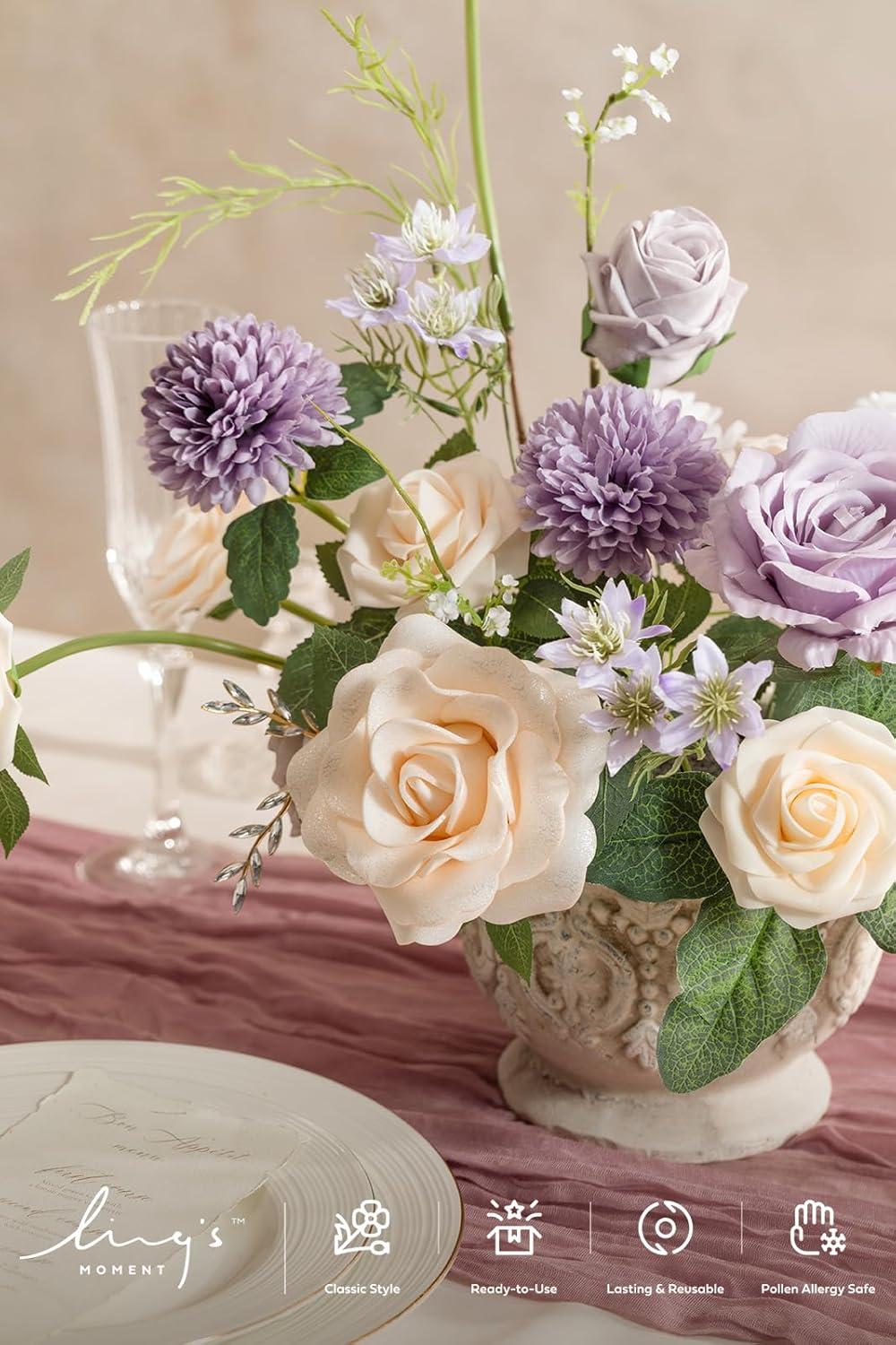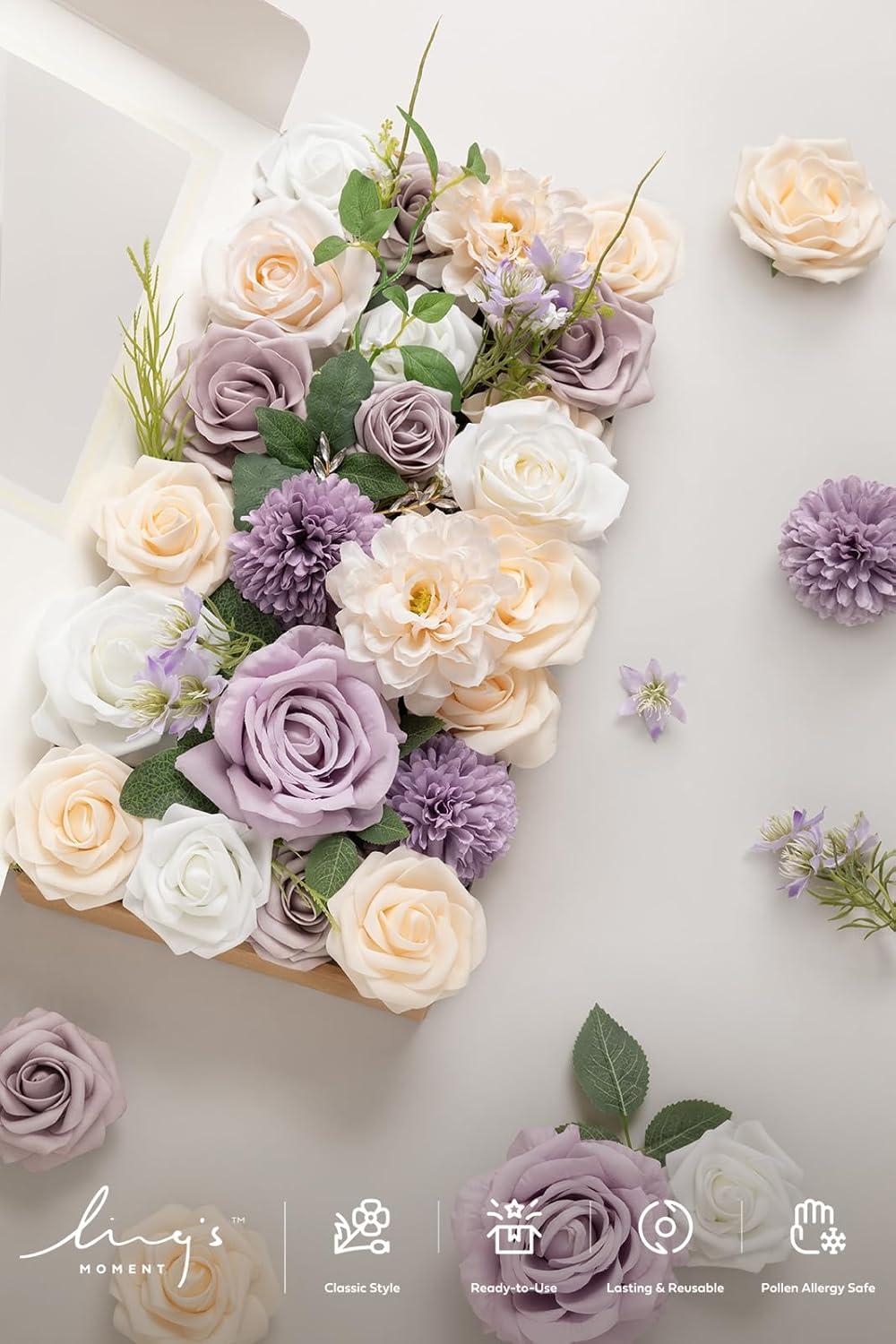Ling’s moment Fake Flowers Box, Faux Artificial Greenery Stems Foam Roses Silk Leaves for Centerpieces Bouquet Wedding Floral Arrangements Bridal Shower Party, Lavender & Cream, Deluxe Combo(Prpl-lavender & Plum)