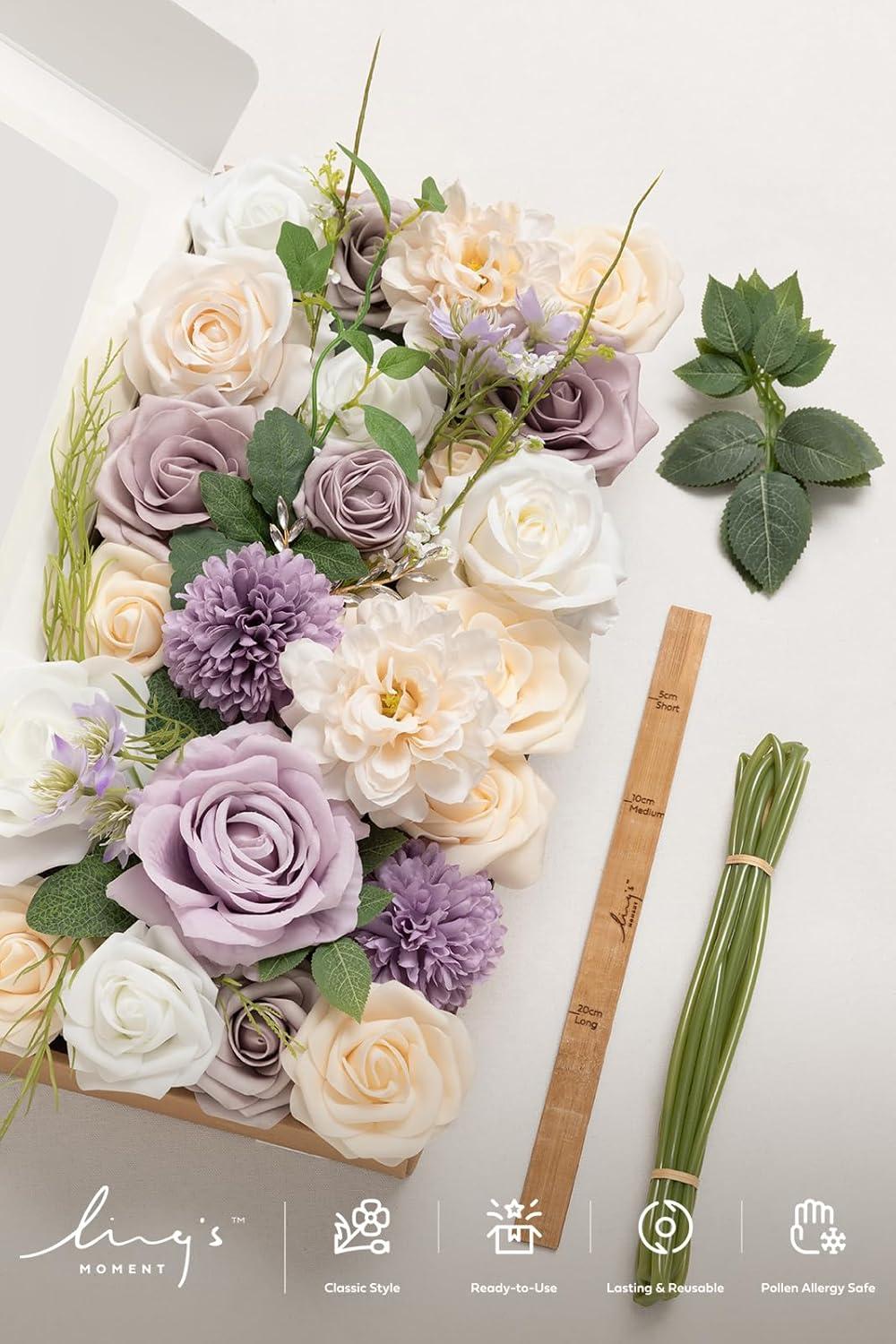 Ling's moment Fake Flowers Box, Faux Artificial Greenery Stems Foam Roses Silk Leaves for Centerpieces Bouquet Wedding Floral Arrangements Bridal Shower Party, Lavender & Cream, Deluxe Combo(Prpl-lavender & Cream)