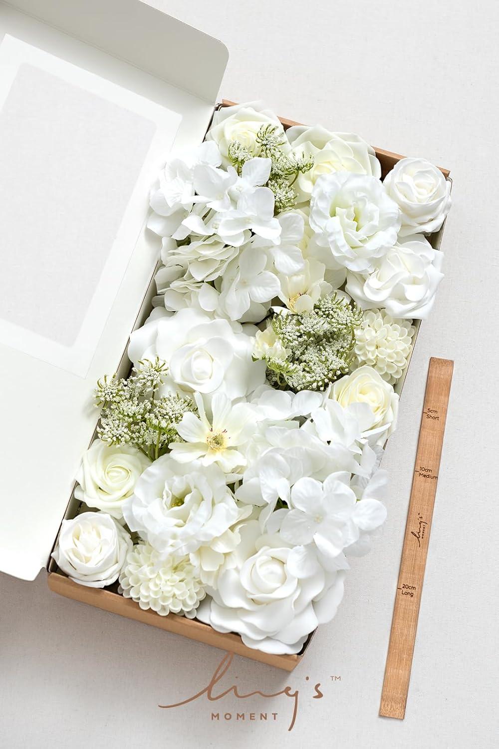 Ling’s moment Fake Flowers Box, Faux Artificial Greenery Stems Foam Roses Silk Leaves for Centerpieces Bouquet Wedding Floral Arrangements Bridal Shower Party, Lavender & Cream, Deluxe Combo(Wht-white & Dark Green)