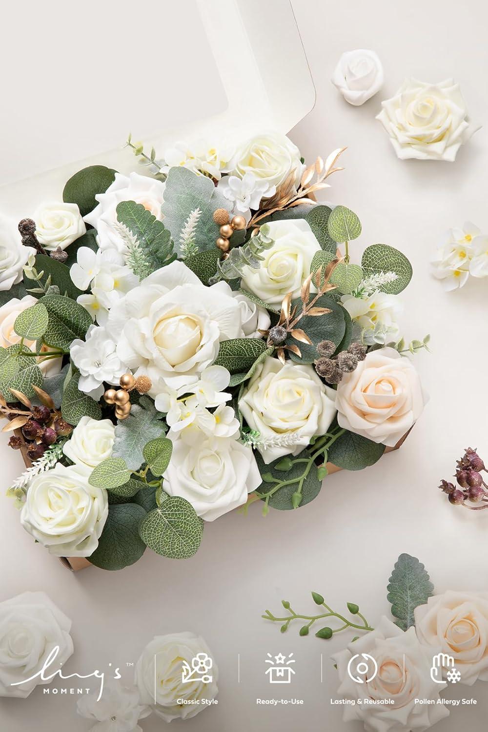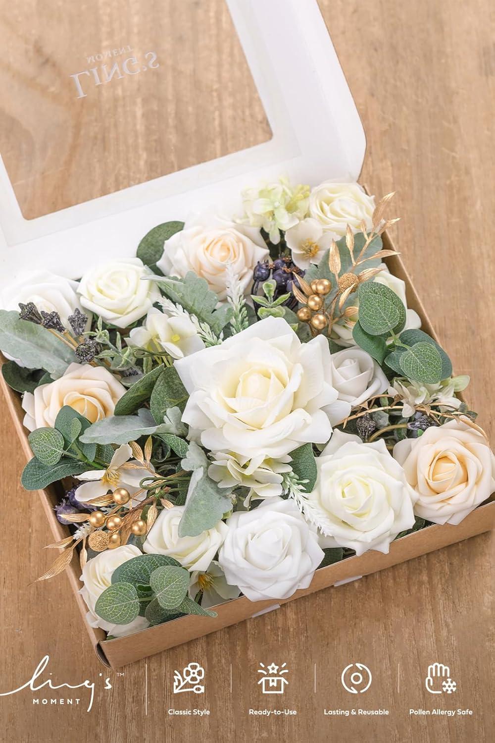 Ling’s moment Fake Flowers Box, Faux Artificial Greenery Stems Foam Roses Silk Leaves for Centerpieces Bouquet Wedding Floral Arrangements Bridal Shower Party, Lavender & Cream, Deluxe Combo(Wht-white & Sage & Gold)