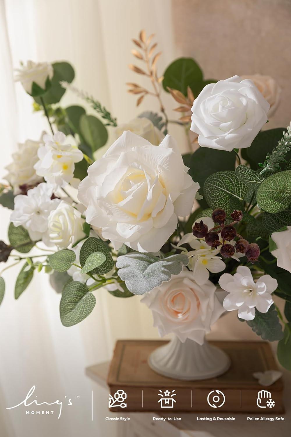 Ling’s moment Fake Flowers Box, Faux Artificial Greenery Stems Foam Roses Silk Leaves for Centerpieces Bouquet Wedding Floral Arrangements Bridal Shower Party, Lavender & Cream, Deluxe Combo(Wht-white & Sage)