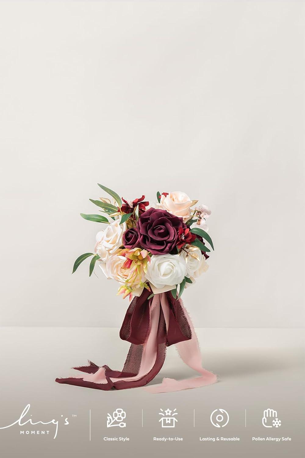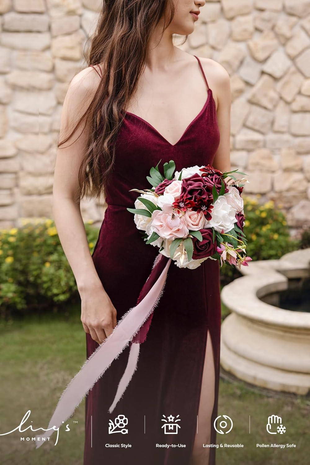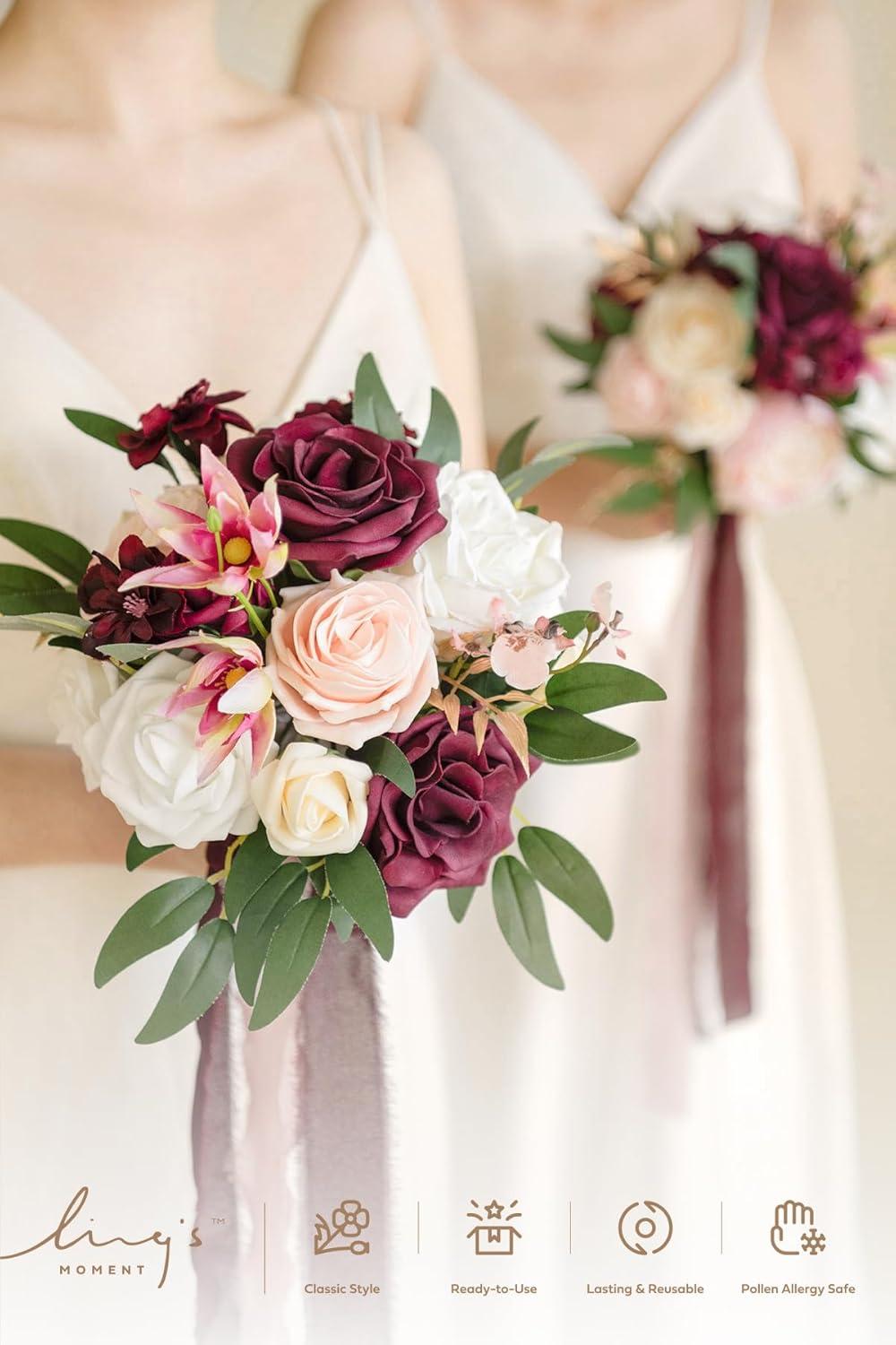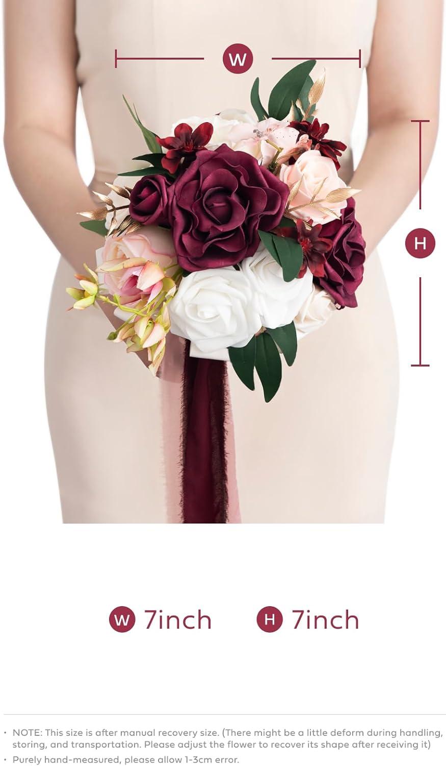 Ling's moment Gold Sparrow Bridesmaid Bouquet, Wedding Bouquets for Bridesmaids, 7 Inch Bridal Bouquets for Bridesmaids, Wedding, Ceremony, Anniversary, etc.(Red-marsala & Blush)