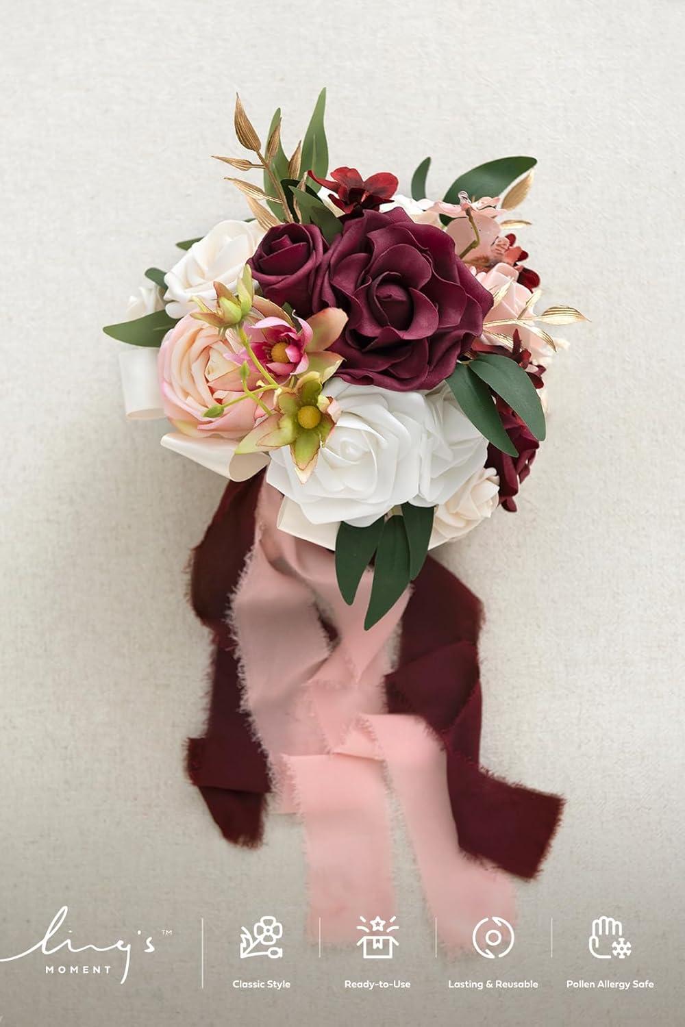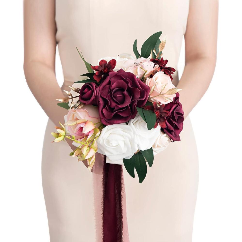 Ling’s moment Gold Sparrow Bridesmaid Bouquet, Wedding Bouquets for Bridesmaids, 7 Inch Bridal Bouquets for Bridesmaids, Wedding, Ceremony, Anniversary, etc.(Red-marsala & Blush)