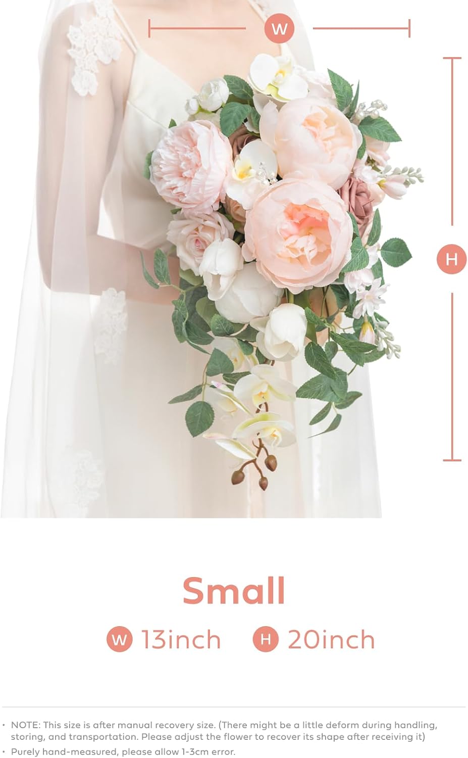 Size: This Blush Garden Wedding Bouquets for Bride is approx. [15 inches W x 20 inches H]. With ribbons card. This size is typically suitable for most brides to carry, this one is recommend for 5'3″-6'1″height and 28″ waist, 5'1″-6'1″height and 29″ waist, 4'11″-6'1″height and 30″ waist, 4'11″-5'5″height and 32″ waist, 4'11″-5'3″height and 34″ waist, 4'11″-5'3″height and 36″ waist.