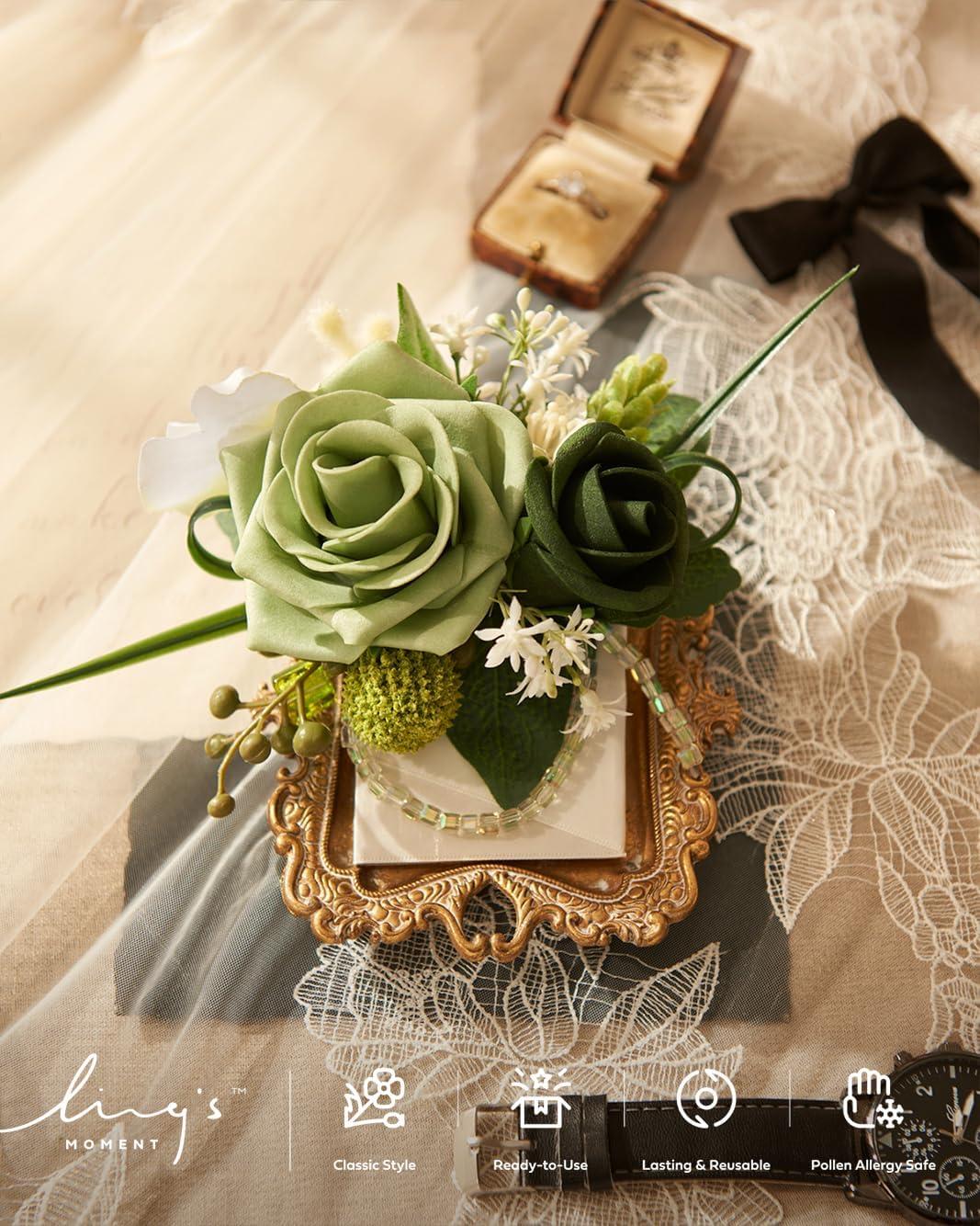 【Material】 The boutonnieres are made of Foam/Silk real-looking artificial flowers and greenery, dotted with some exquisite accessories.