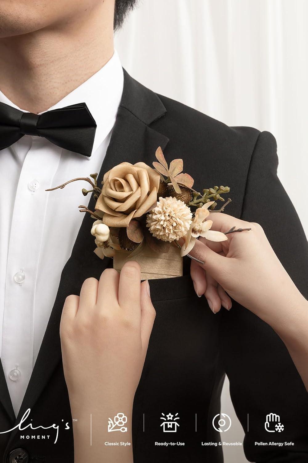 Ling's moment Pocket Boutonniere Single, Boutonniere for Men Groom for Wedding, Prom, Homecoming, Anniversary, Graduation, etc.Tawny Beige White Orchid, 6" W x 5" H(Brn-sand Beige & Gold Sparrow)