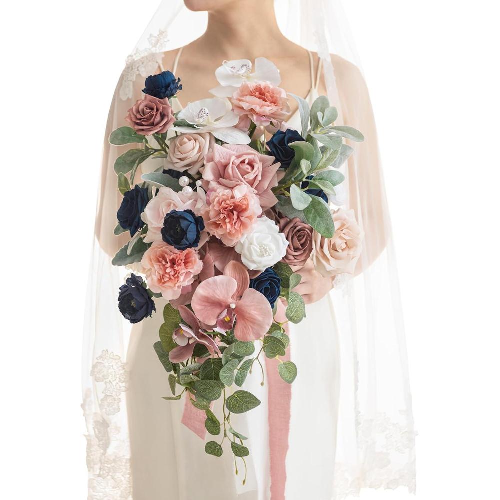 Ling's moment Tawny Beige and Brown Bridal Bouquet Cascading, Brown Wedding Bouquets for Bride, 13 Inch Bride Bouquets for Wedding Artificial Flowers Bouquets(Pk-exquisite Dusty Rose & Navy)