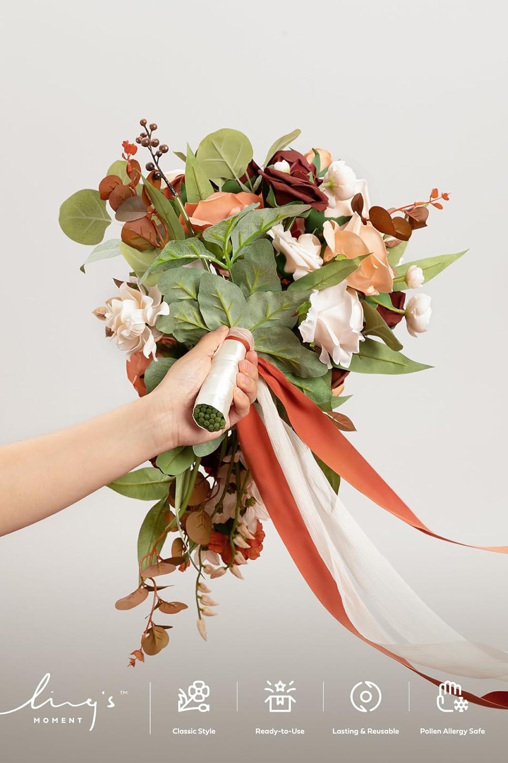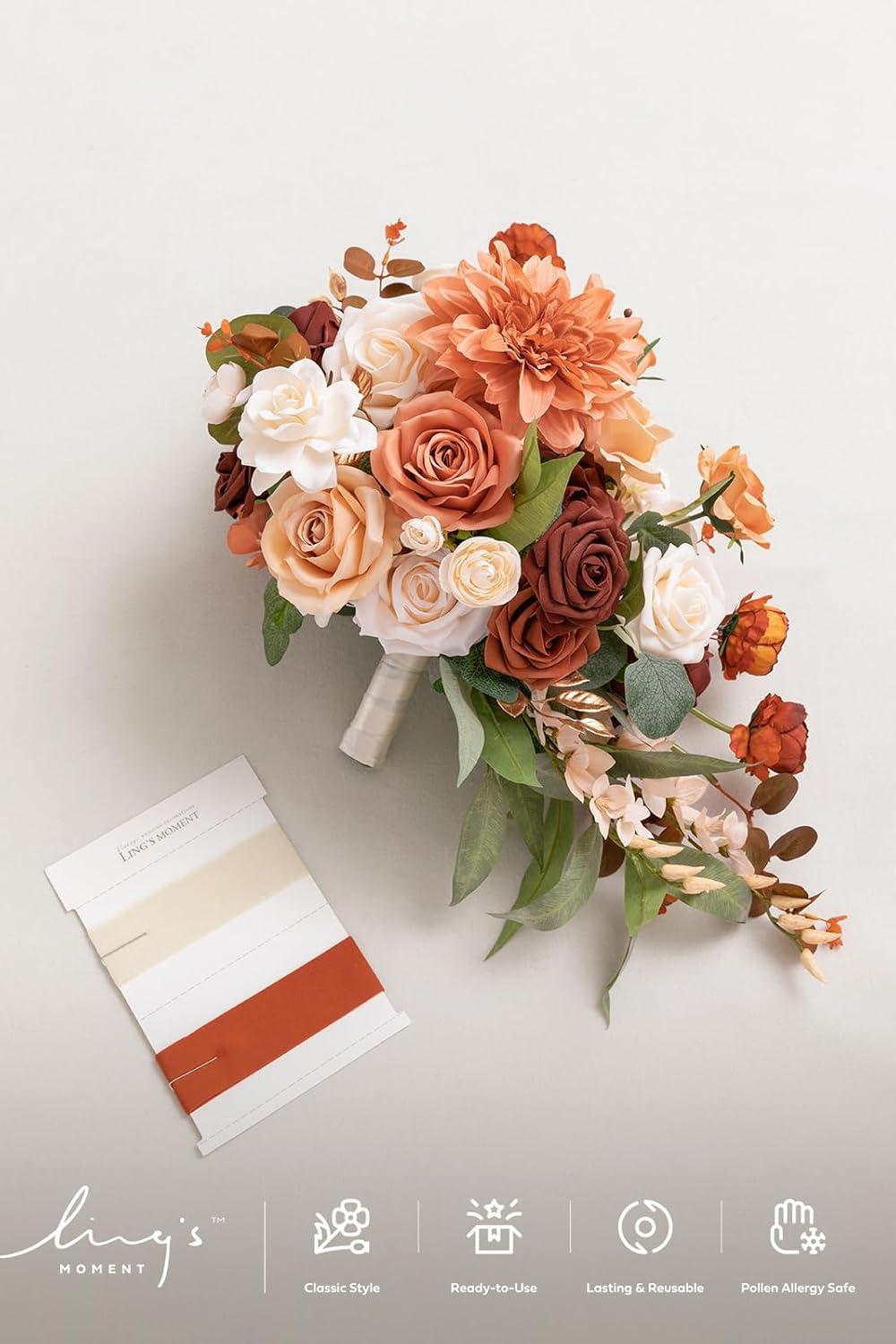 Ling’s moment Terracotta Bridal Bouquet Cascading, Burnt Orange Wedding Bouquets for Bride, 13 Inch Bride Bouquets for Wedding Artificial Flowers Bouquets(Or-chic Terracotta)