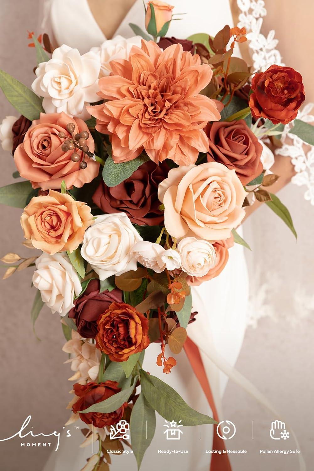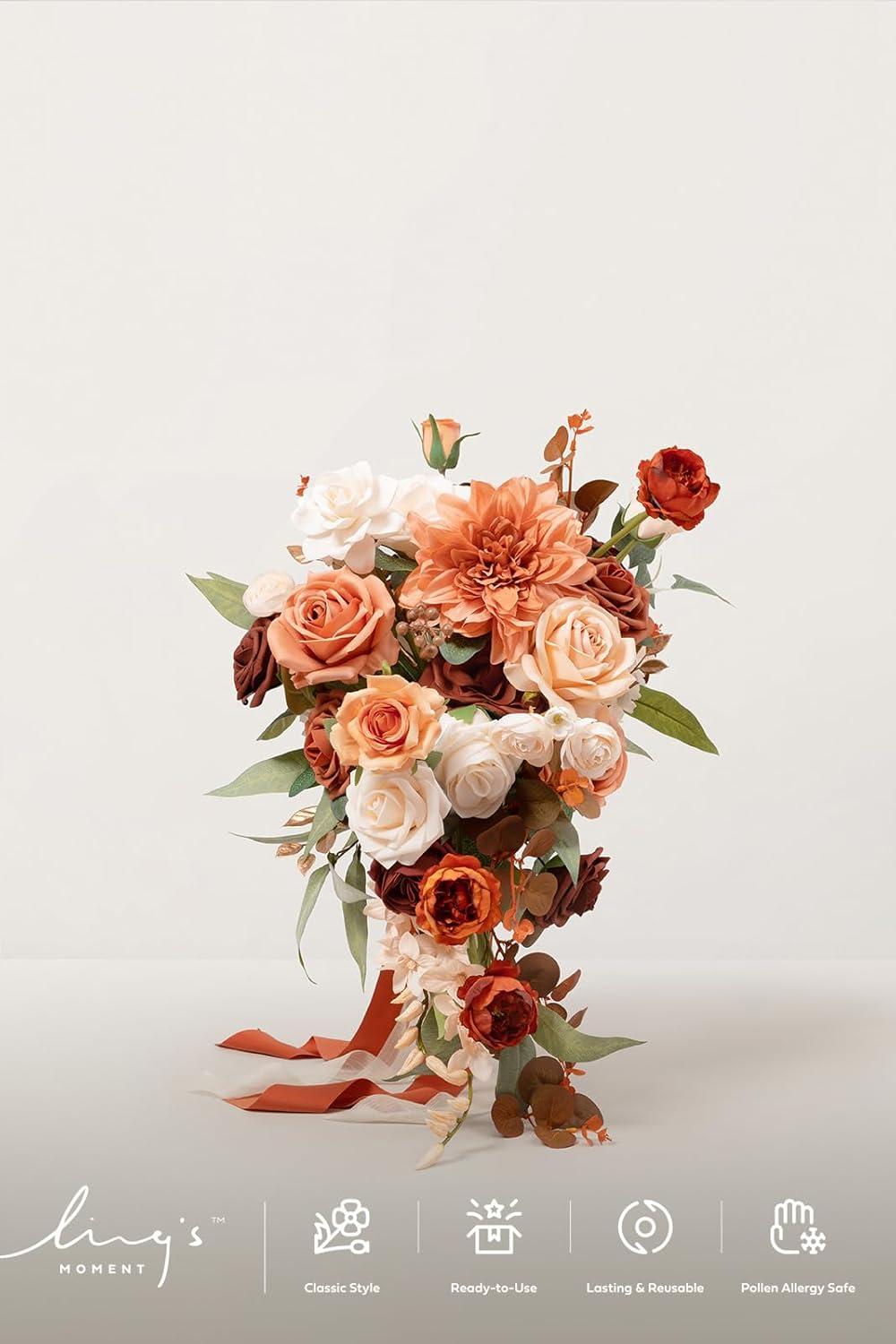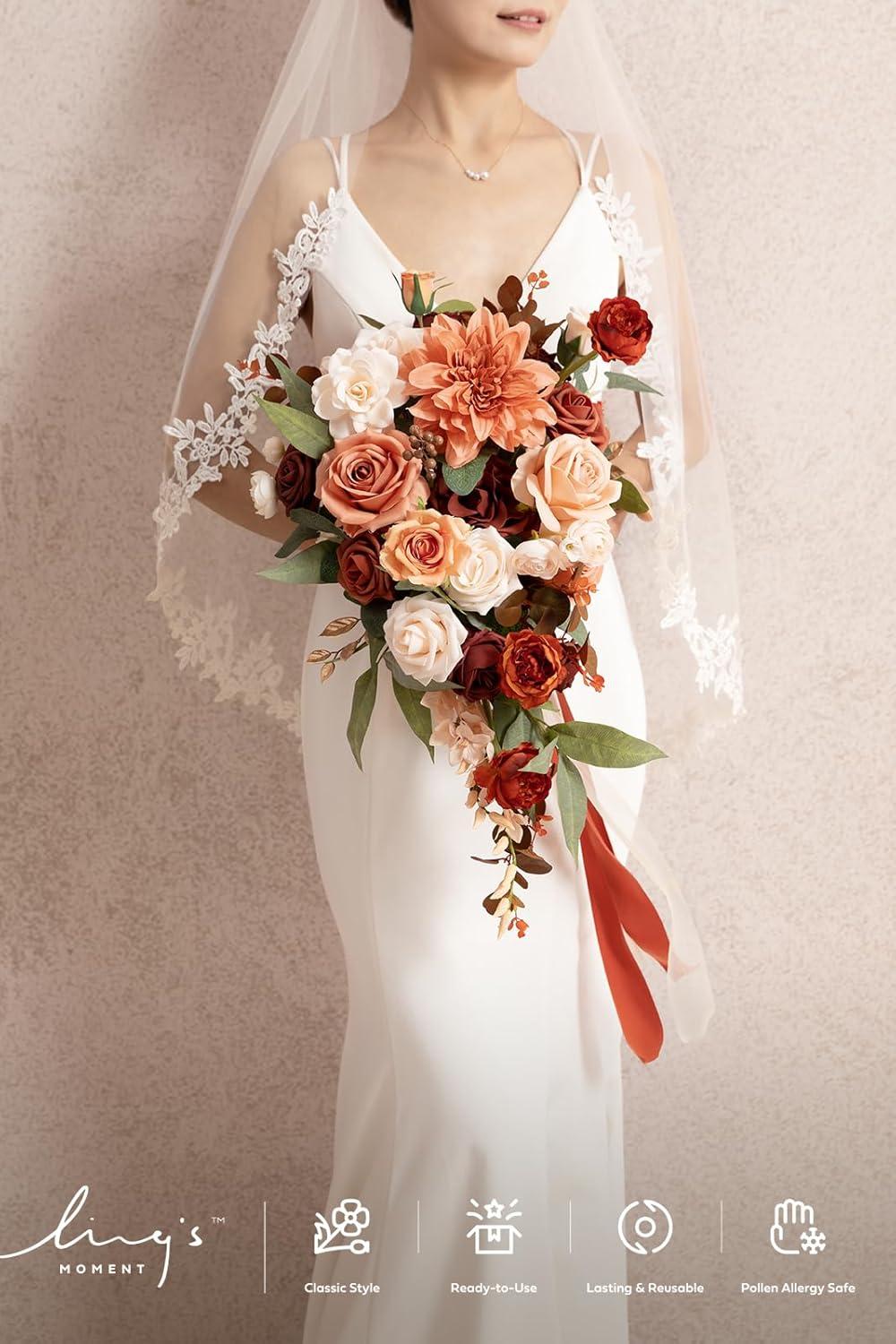 Ling’s moment Terracotta Bridal Bouquet Cascading, Burnt Orange Wedding Bouquets for Bride, 13 Inch Bride Bouquets for Wedding Artificial Flowers Bouquets(Or-sunset Terracotta)