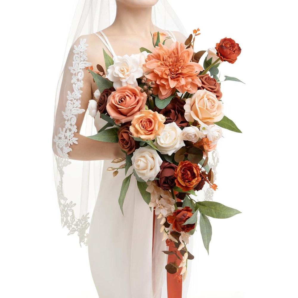imageLings moment Terracotta Bridal Bouquet Cascading Burnt Orange Wedding Bouquets for Bride 13 Inch Bride Bouquets for Wedding Artificial Flowers BouquetsOrsunset Terracotta