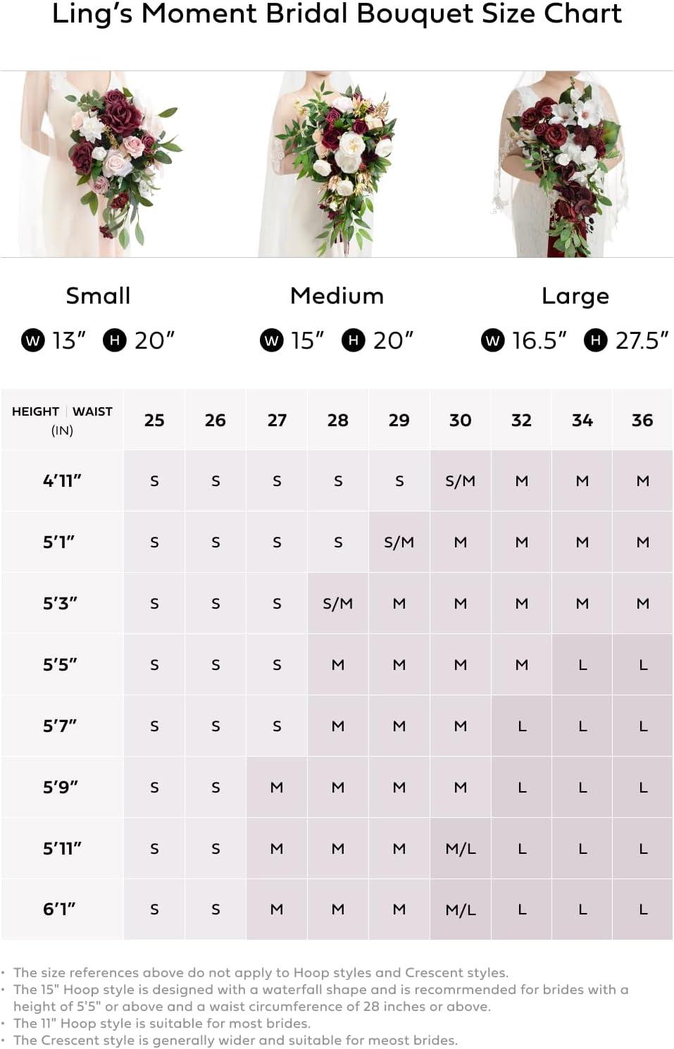 Size: This Wedding Bouquets for Bride is approx. [13 inches W x 20 inches H]. With ribbons card. This size is typically suitable for most brides to carry, this one is recommend for 4'11″-6'1″height and 25″ waist, 4'11″-6'1″height and 26″ waist, 4'11″-5'7″height and 27″ waist, 4'11″-5'3″height and 28″ waist, 4'11″-5'1″height and 29″ waist, 4'11″height and 30″ waist.