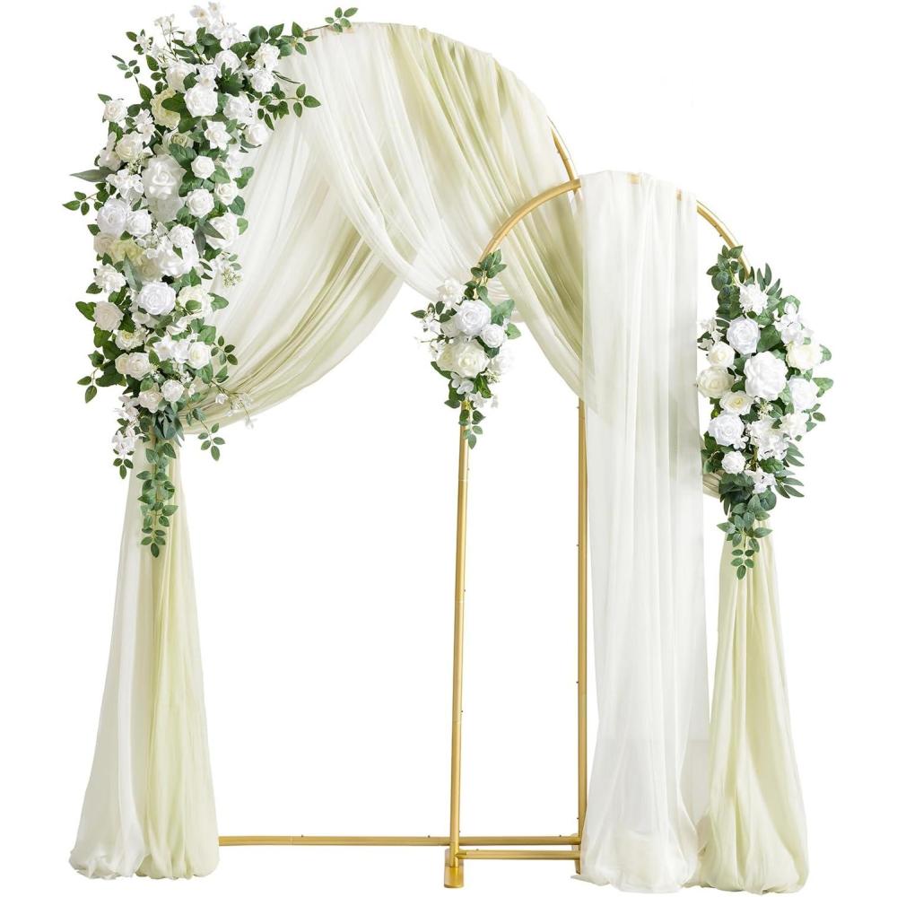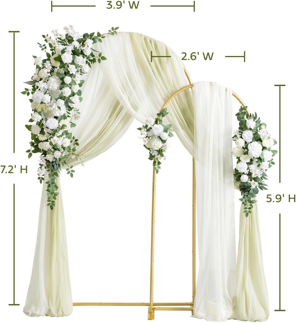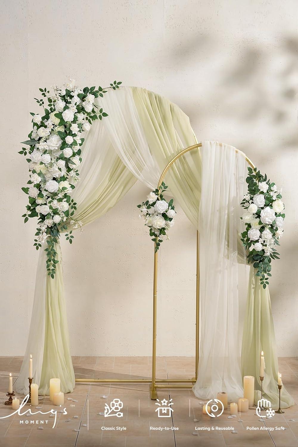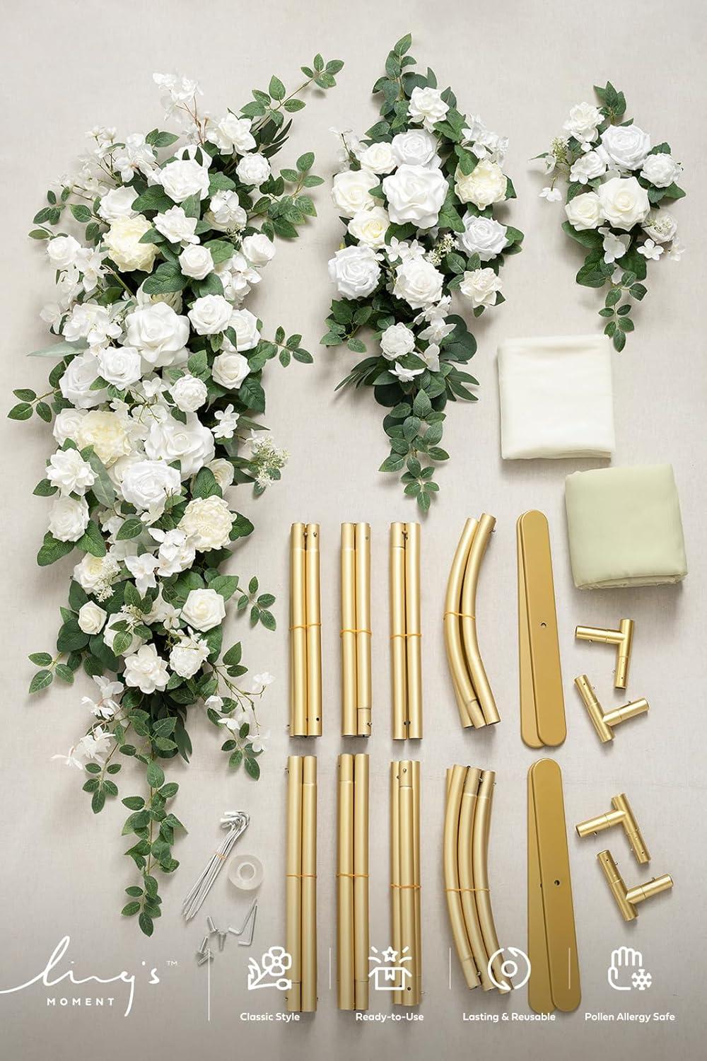 Package Includes: Flower Garlands*3, Arch Frame*2, Fabric Linens*2, Ground Stakes*6.