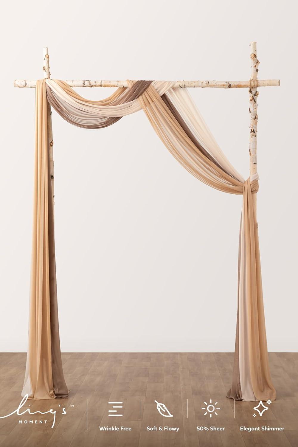 FIT ON DECOR: 5ft W x 20ft L drape tailored for decorating 6.5ft W x 6.5ft H arch stand as photography show. 3 panels creating a beautifully layered effect. Suitable for decorating any wedding arch, like canopy, arbor, or altar.