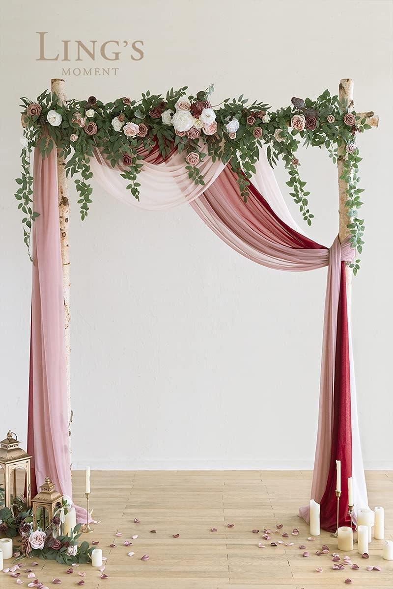 Ling's moment Wedding Arch Draping Fabric 3 Panels 20Ft Purple Chiffon Fabric,Sheer Hanging Drapes Arrangement for Wedding Ceremony Backdrop Party Swag Home Decor (Lilac & Gold)(Red-burgundy & Dusty Rose & Ivory)